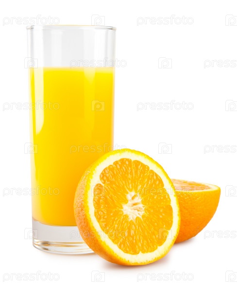 Апельсин и стакан сока на белом фоне