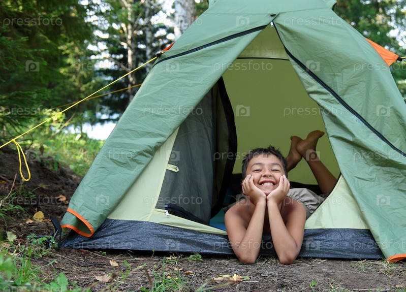 Счастливый мальчик, лежащий в палатке в лесу летом