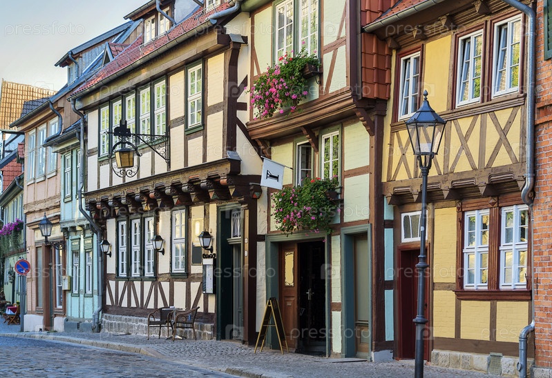 Улица с фахверковыми домами в городе Кведлинбург, Германия