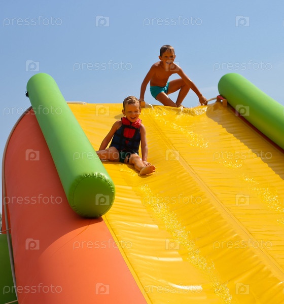 Радостные дети на горке в аквапарке