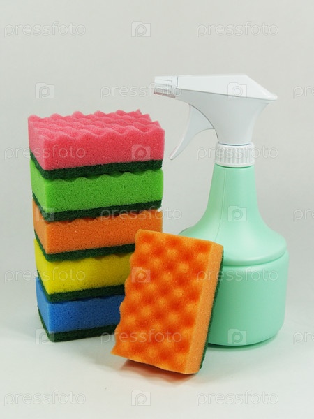 Разноцветные губки с светло-зеленый пульверизатор крупным планом