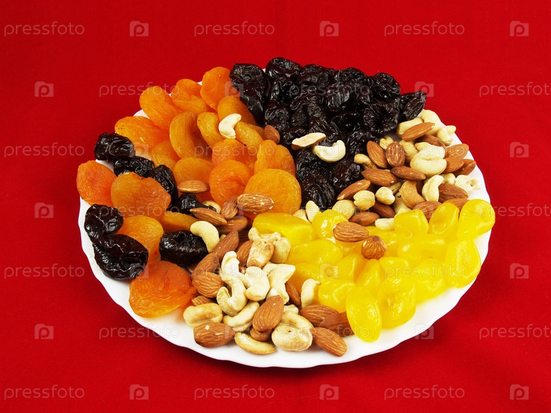 Сухофрукты с орехами на белой тарелке на красном фоне
