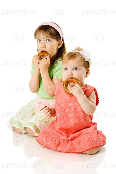 Две милые девочки кушают бублики на белом фоне
