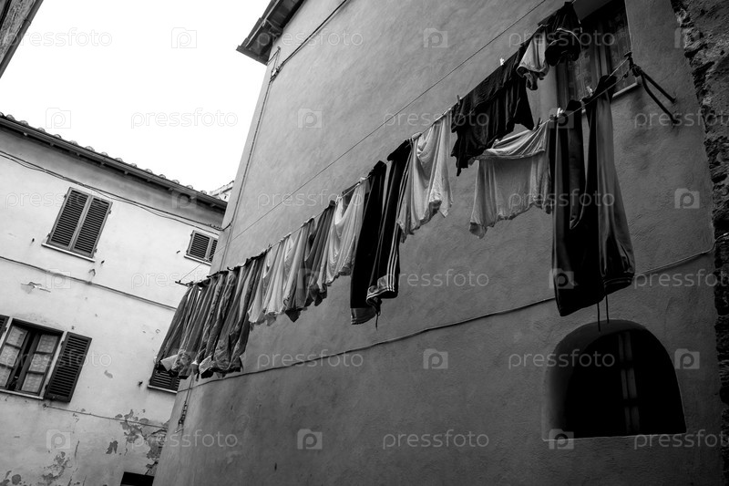 Бельевые веревки над тихой итальянской улицей, Тоскана, Италия, Европа