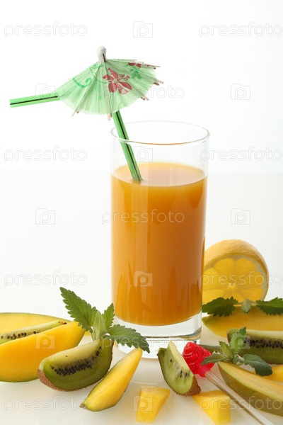 Сок и фрукты на белом фоне