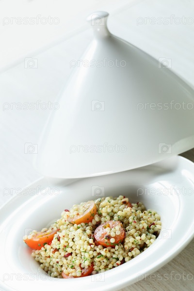 Пшено в белой тарелке на деревянном столе