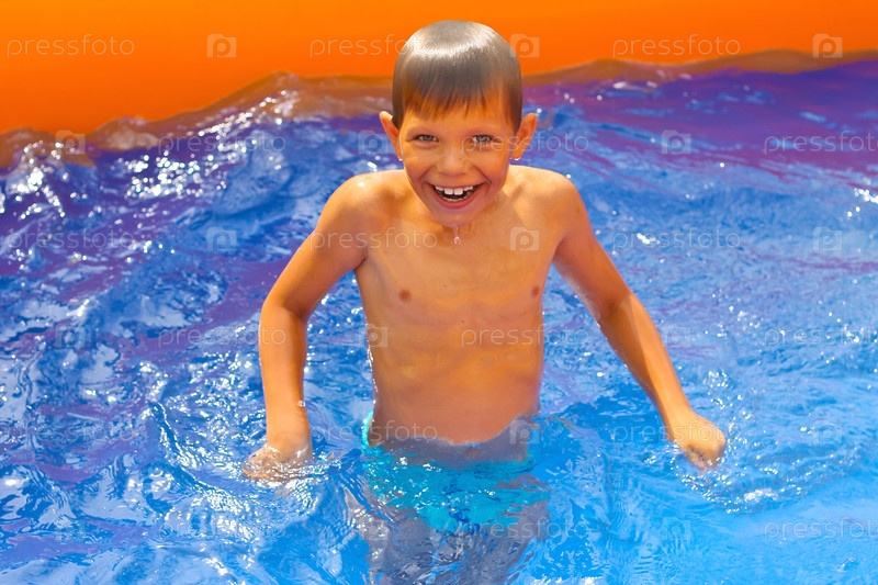 Улыбающийся мальчик плавает в бассейне на каникулах