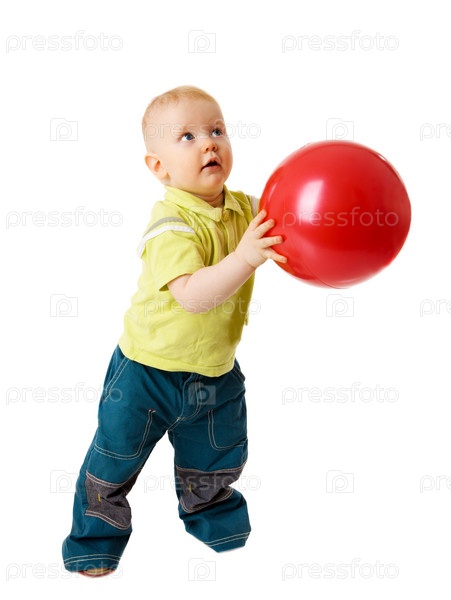 Маленький ребенок с красным мячом на белом фоне