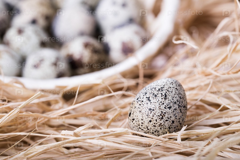 Перепелиное яйцо в соломе с корзиной на фоне