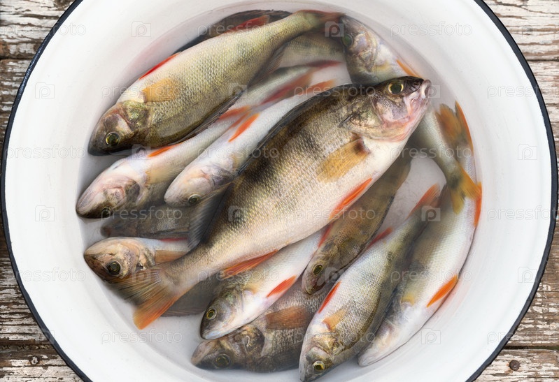 Свежий окунь в белой тарелке на деревянном табурете