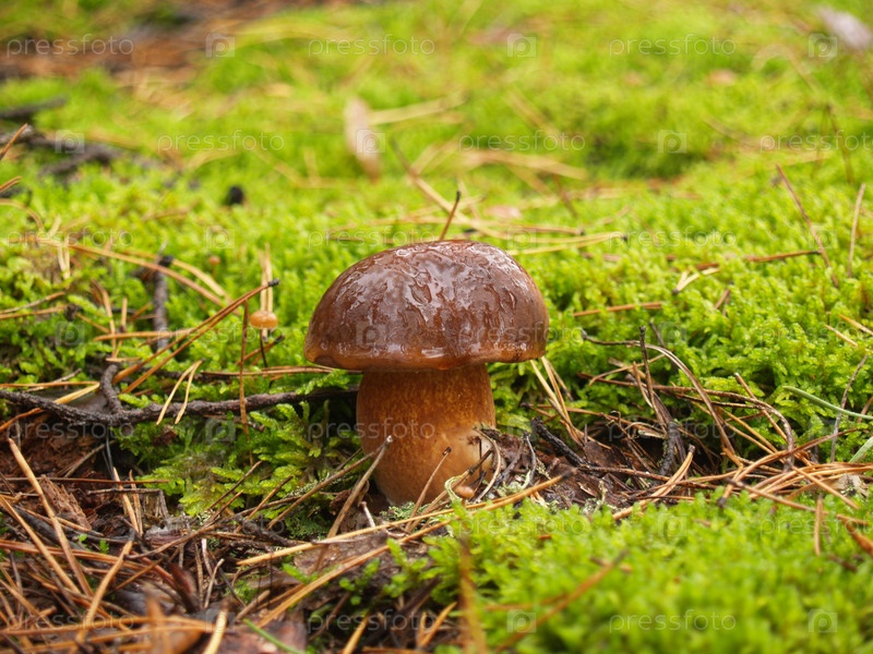 Белый гриб в каплях дождя в осеннем лесу