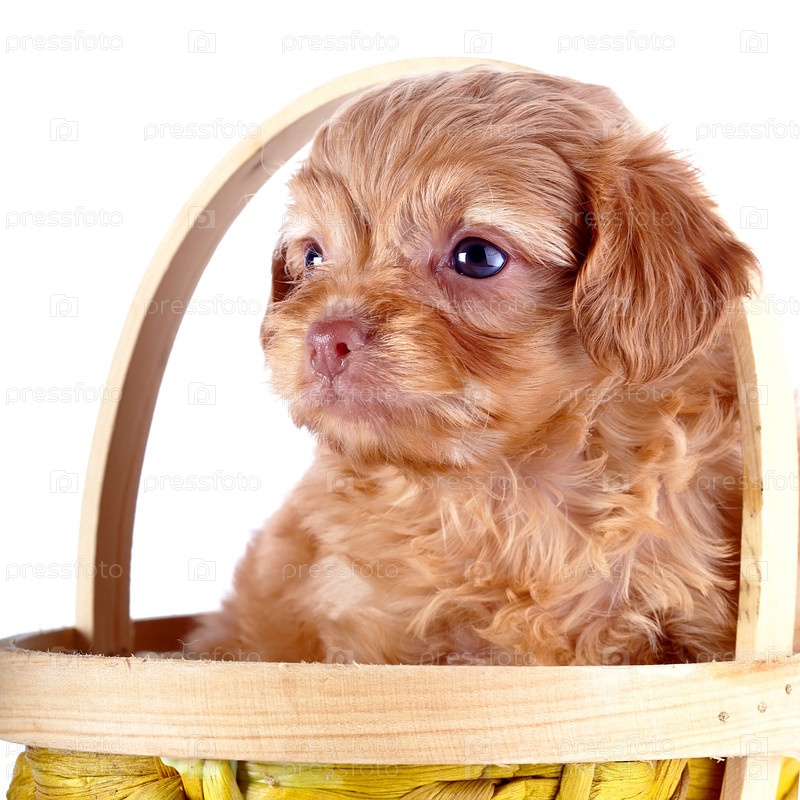 Портрет щенка декоративной породы в желтой корзине