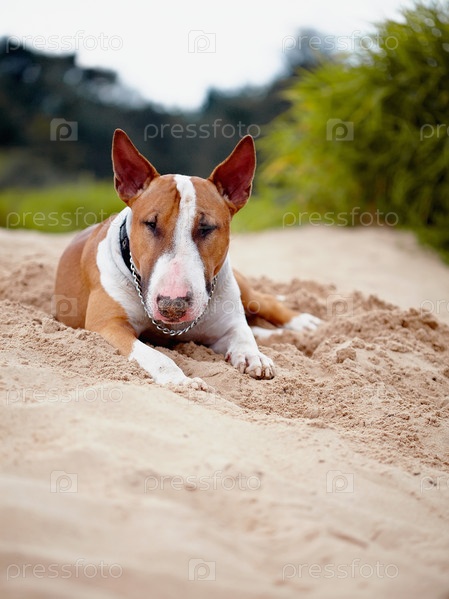 Английский бультерьер лежит на песке