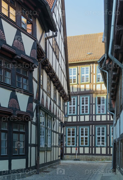 Улица с фахверковыми домами в городе Кведлинбург, Германия