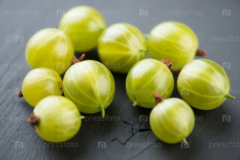 Спелый зеленый крыжовник крупным планом на черном деревянном фоне