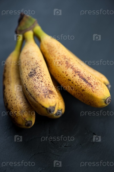 Спелые мини-бананы на черном деревянном фоне