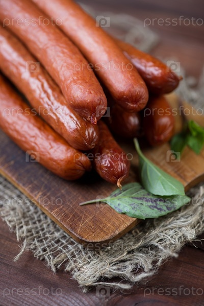 Копченые колбаски и базилик на деревянной доске, крупный план