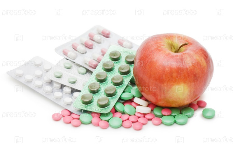 Таблетки и красное яблоко, изолированы на белом фоне