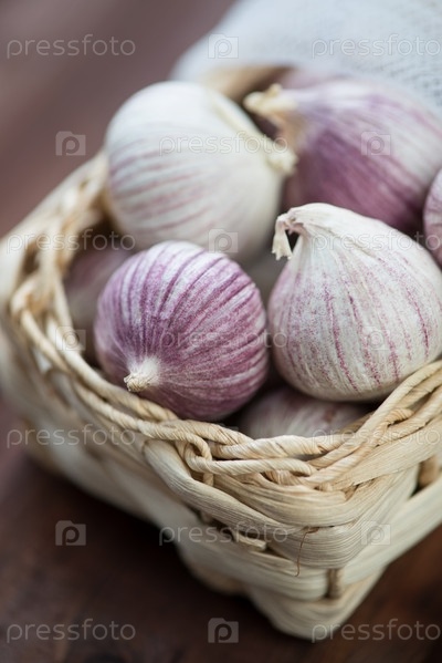 Китайский чеснок соло в плетеной корзинке, крупный план