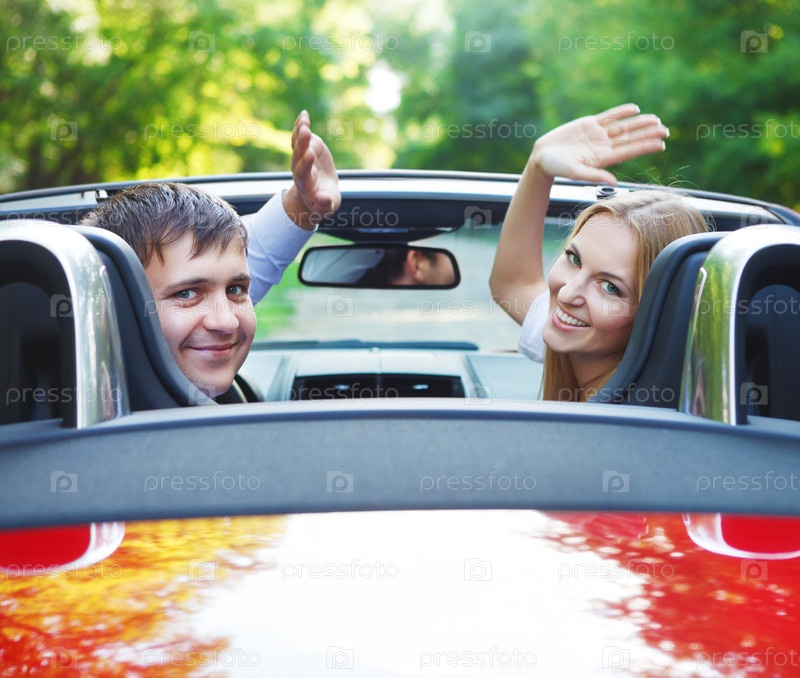 Пара в красном кабриолете в солнечный день