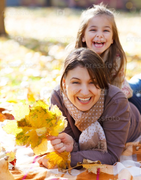 Счастливая молодая мать с дочерью в осеннем парке