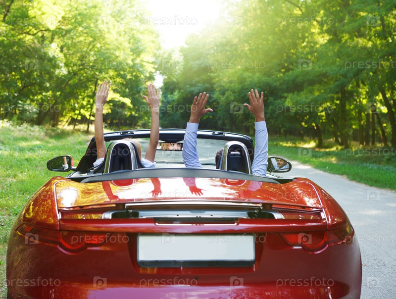 Свободная счастливая пара едет в красном ретро-автомобиле с поднятыми руками