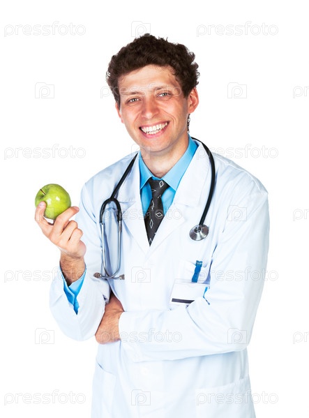 Портрет улыбающегося врача с зеленым яблоком на белом фоне