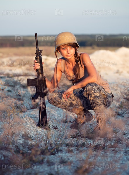Женщина-солдат в камуфляже с ружьем