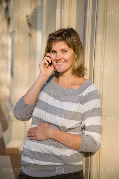 Портрет улыбающейся беременной девушки с телефоном