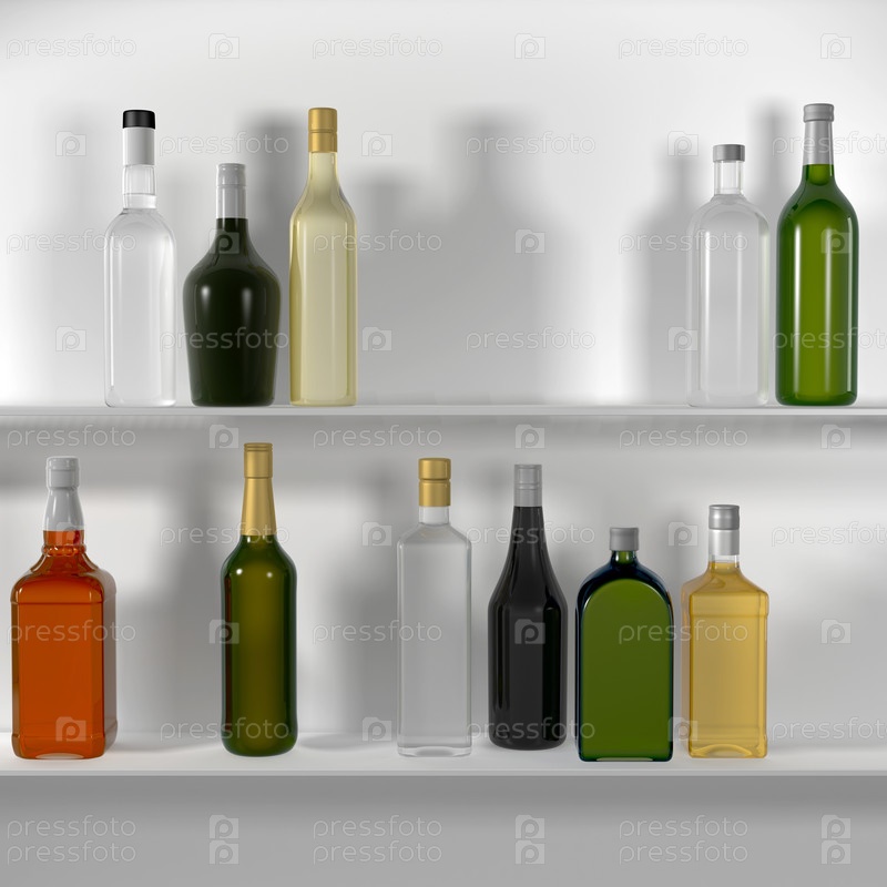Барная полка с бутылками. Изолированная визуализация на белом фоне