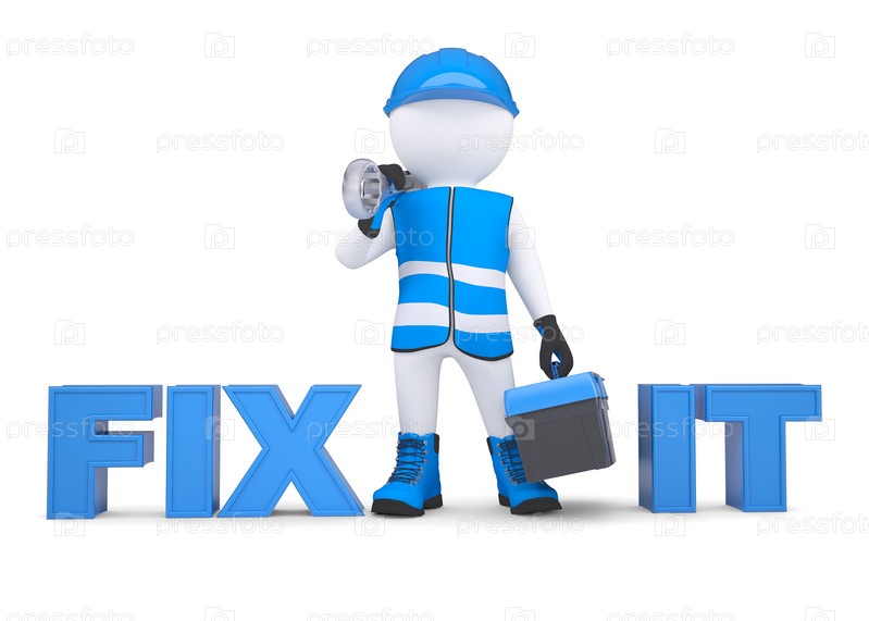 3D человек в спецодежде с ключом и ящиком инструментов. изолированная визуализация на белом фоне