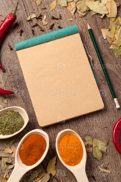 Блокнот, специи в ложке