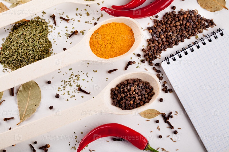 Блокнот, красный перец и специи в ложках