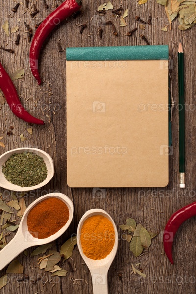 Перец, специи в ложке, блокнот и карандаш