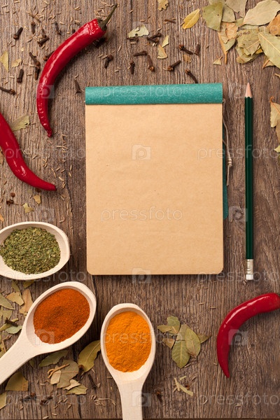 Перец, специи в ложке, блокнот и карандаш