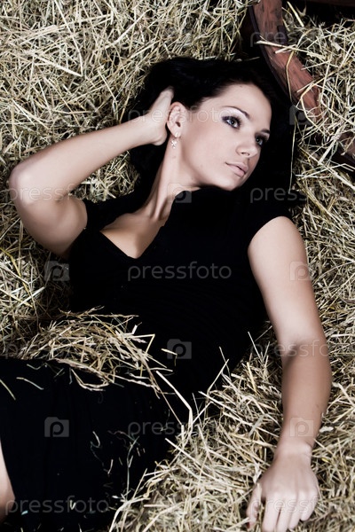 Красивая молодая женщина, лежащая на сене