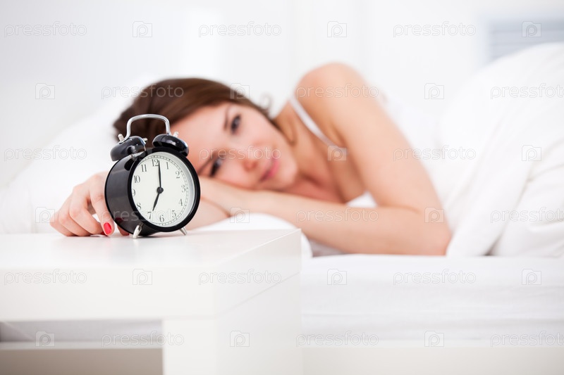 Женщина в постели с будильником