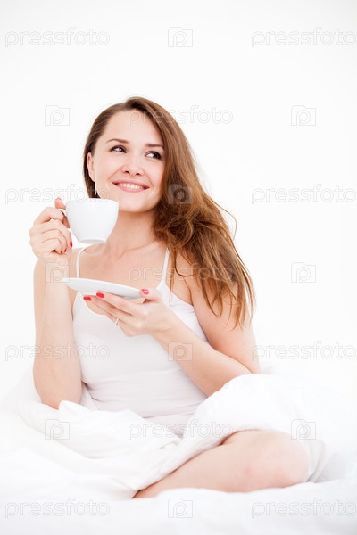 Женщина сидит на кровати с чашкой