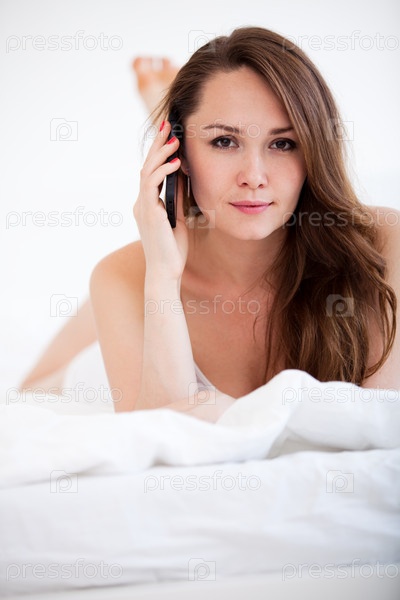Женщина с телефоном лежит на кровати