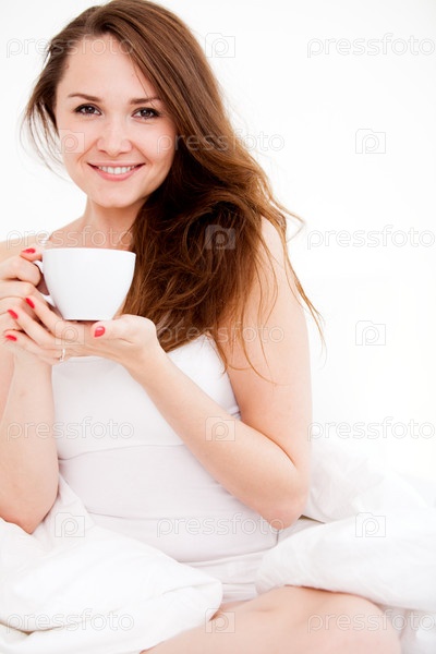 Женщина с чашкой сидит на кровати