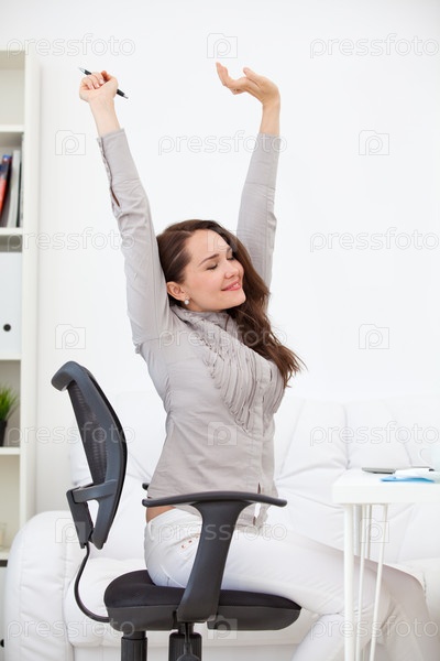 Женщина потягивается на рабочем месте