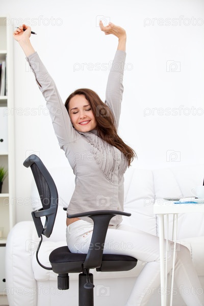 Женщина потягивается на рабочем месте