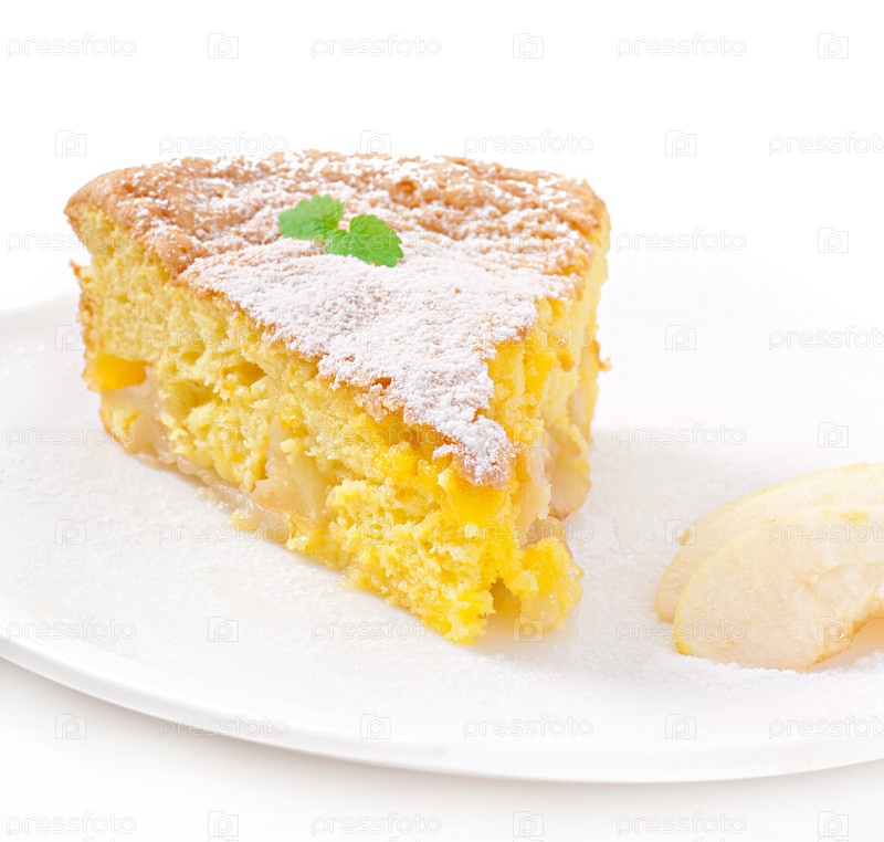 Ломтик яблочного пирога на тарелке, украшенного мятой