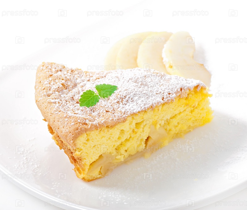 Ломтик яблочного пирога на тарелке, украшенного мятой