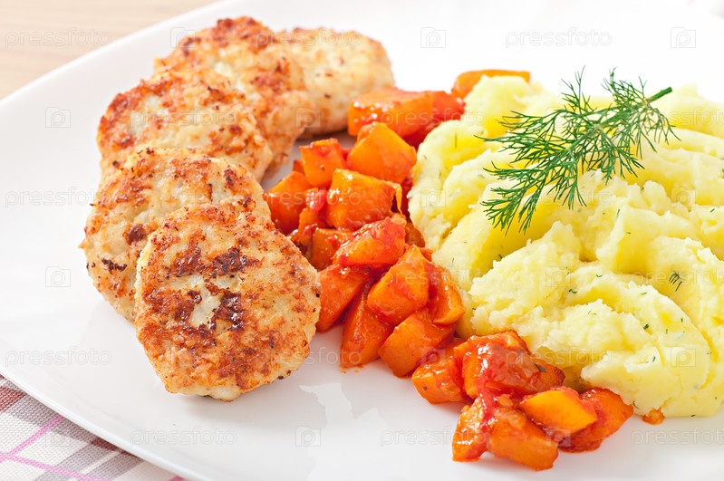 Жареные котлеты, тушеная тыква и картофельное пюре