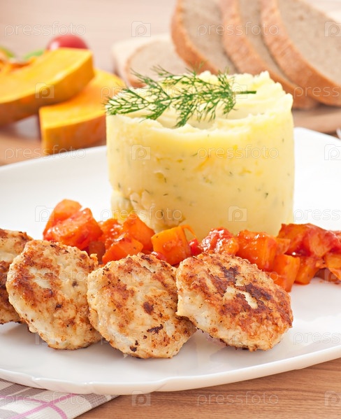 Жареные котлеты, тушеная тыква и картофельное пюре