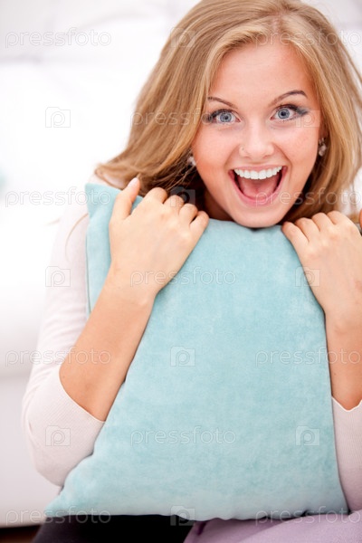 Улыбающаяся женщина обнимает подушку