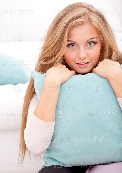 Улыбающаяся женщина обнимает подушку