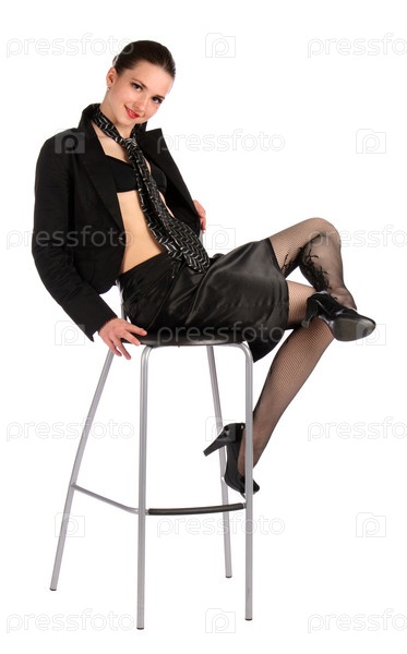 Девушка в черном костюме сидит на стуле