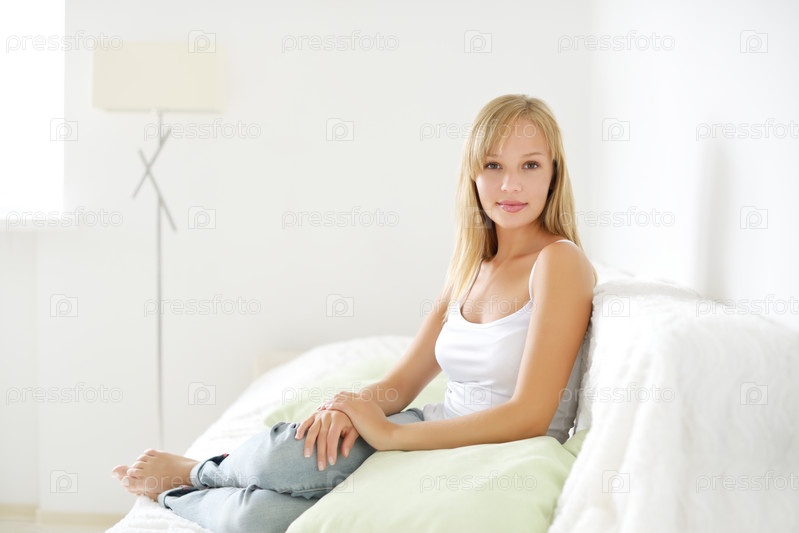 Улыбающаяся девушка, сидящая на диване